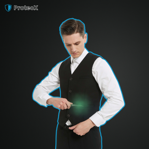 Our ProtecX tactical vest uses a high-density fiber shield engineered to disperse impact and prevent blade penetration. It maintains a sleek, professional look while delivering real protective performance trusted by security personnel.